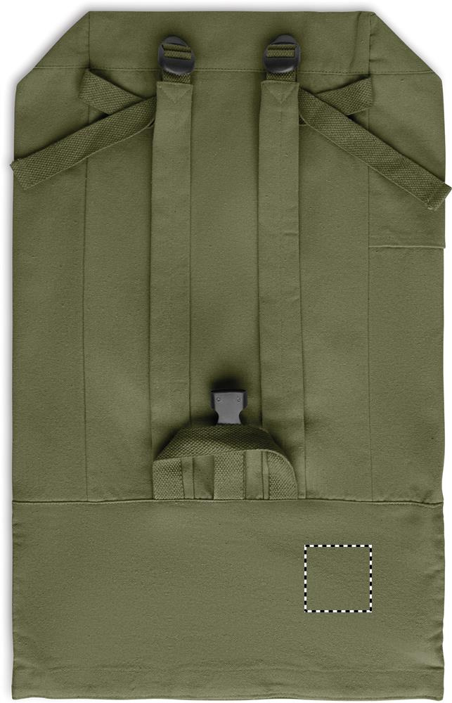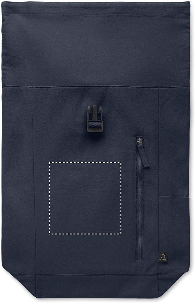Rolltop-ryggsäck med kardborrestängning i 390 gr/m² återvunnen bomull (80%) och återvunnen polyester (20%). Ficka med dragkedja på framsidan.