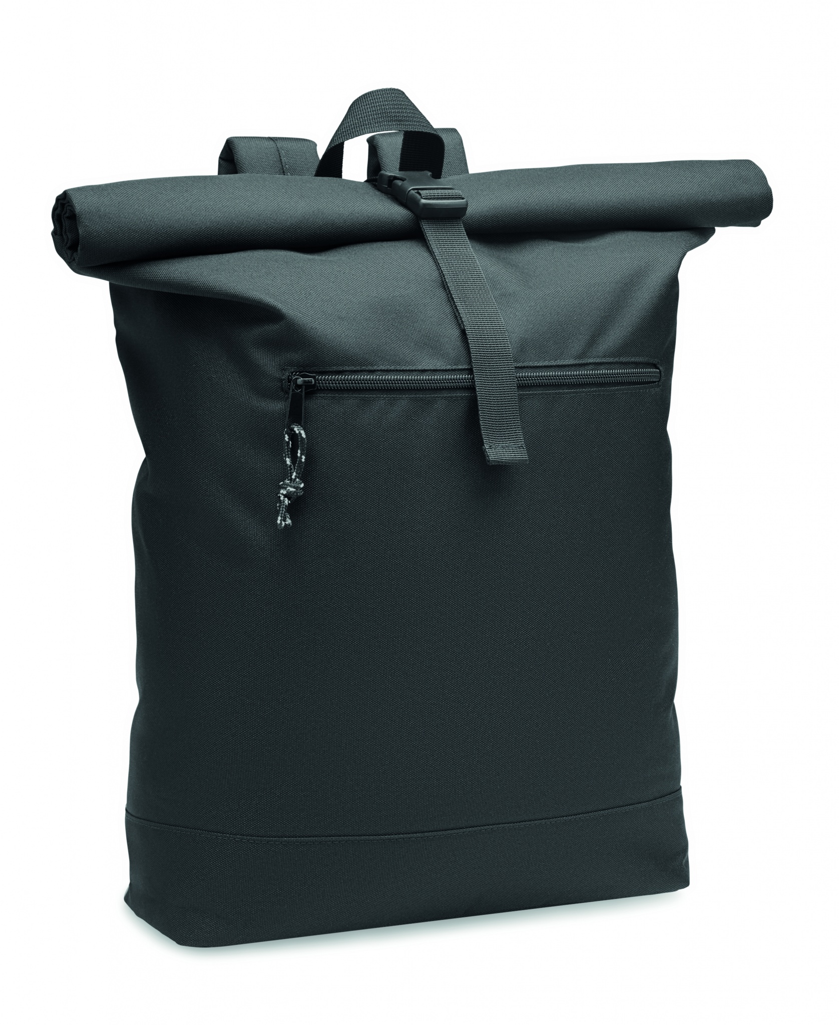 Ryggsäck i 600D RPET polyester med rullstängning, vadderad rygg och förstärkning i botten. Ficka med dragkedja på framsidan. Fodret är i RPET 210D RPET.