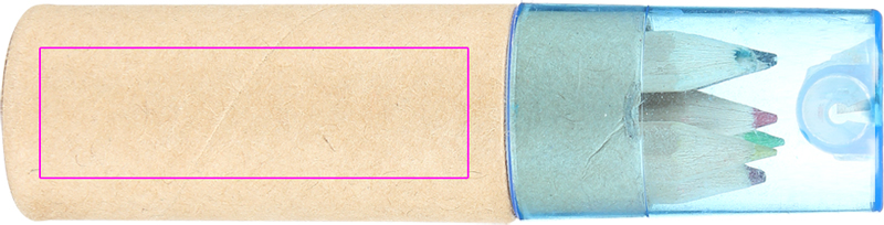 Kartong med sex korta, tjocka färgpennor och integrerad vässare med blått transparent plastlock. Vi trycker din logotyp på kartongen.